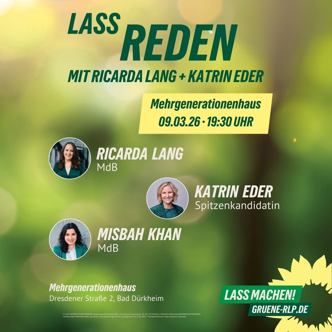 Am Montag, 09.03. (ab 19:30 Uhr) ist unsere Bundestagsabgeordnete Ricarda Lang im Mehr-Generationen-Haus in Bad Dürkheim. Gemeinsam mit der rheinland-pfälzischen Spitzenkandidatin Katrin Eder wird sie über die aktuellen Herausforderungen grüner Frauenpolitik sprechen.